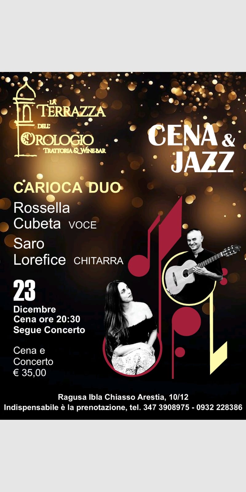 La Terrazza dell’Orologio – Cena & Jazz Venerdì 12 dicembre 𝗼𝗿𝗲 20:30 CARIOCA DUO Duo acustico composto da Saro Lorefice alla chitarra classica 🎸 e Rossella Cubeta alla voce🎙. Il "Carioca Duo" propone un percorso musicale dedicato principalmente alla Bossa Nova (l'incontro fra la samba e le sonorità jazz americane nato negli anni '50 a