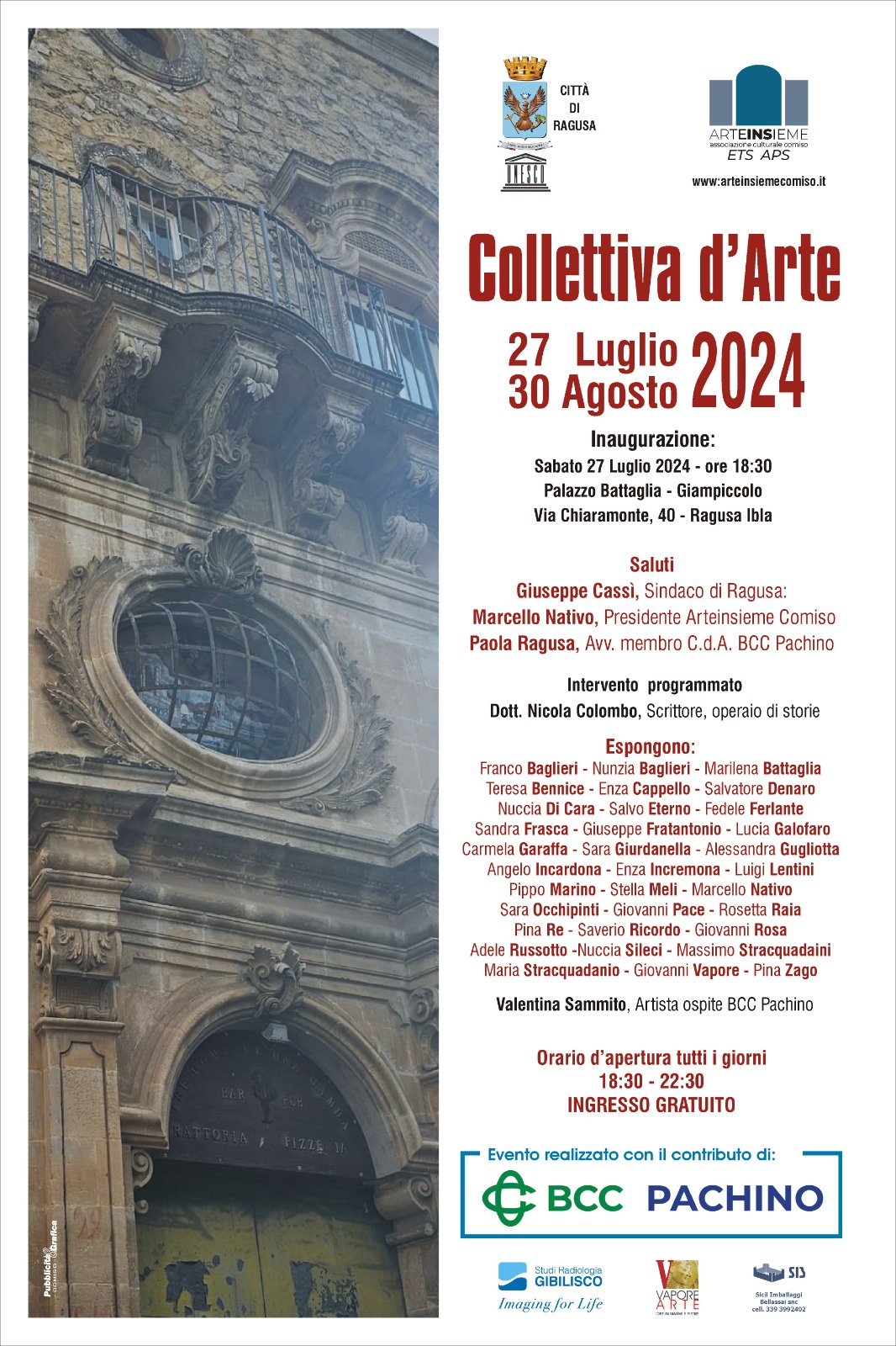 Orario d'apertura tutti i giorni 18:30 - 22:30 Ingresso gratuito Palazzo Battaglia - Giampiccolo Via Chiaramonte, 40 - Ragusa Ibla Espongono: Franco Baglieri - Nunzia Baglieri - Marilena Battaglia - Teresa Bennice - Enza Cappello - Salvatore Denaro - Nuccia Di Cara - Salvo Eterno - Fedele Ferlante - Sandra Frasca - Giuseppe Frantoio -