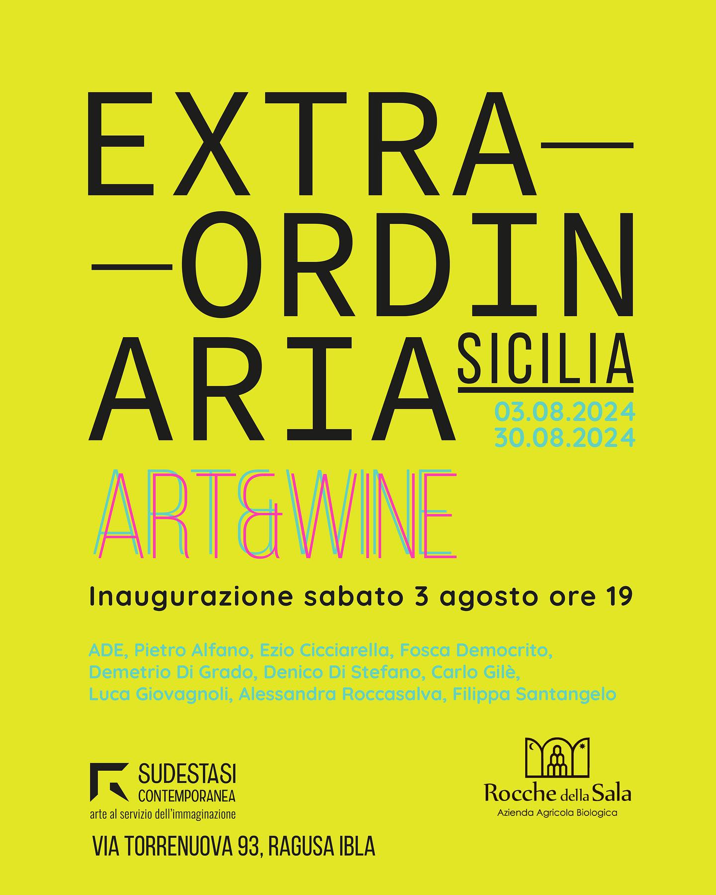 3-30 agosto 2024: dal martedì alla domenica 18:00-21:00 La storia e la cultura siciliana sono il frutto di incroci “Extra-Ordinari” con i popoli giunti sull'isola sin dal XIII secolo a.C. Attraverso lo sguardo degli artisti selezionati (ADE, Pietro Alfano, Ezio Cicciarella, Fosca Democrito, Demetrio Di Grado, Denico Di Stefano, Carlo Gilè, Luca Giovagnoli, Alessandra Roccasalva,