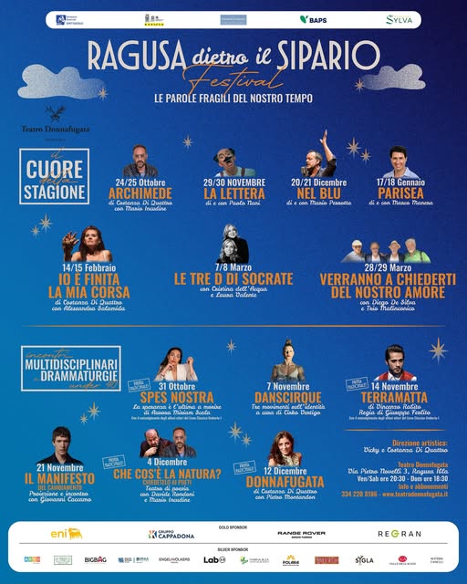 NEL BLU, di e con Mario Perrotta Ritorna la magia del 𝑭𝒆𝒔𝒕𝒊𝒗𝒂𝒍 “𝑹𝒂𝒈𝒖𝒔𝒂 𝒅𝒊𝒆𝒕𝒓𝒐 𝒊𝒍 𝒔𝒊𝒑𝒂𝒓𝒊𝒐 – 𝑳𝒆 𝑷𝒂𝒓𝒐𝒍𝒆 𝑭𝒓𝒂𝒈𝒊𝒍𝒊 𝒅𝒆𝒍 𝒏𝒐𝒔𝒕𝒓𝒐 𝒕𝒆𝒎𝒑𝒐”, con una nuova stagione di teatro, poesia e musica nel cuore di Ragusa Ibla.𝑈𝑛 𝑣𝑖𝑎𝑔𝑔𝑖𝑜 𝑑𝑖 𝑒𝑚𝑜𝑧𝑖𝑜𝑛𝑖, 𝑝𝑒𝑛𝑠𝑖𝑒𝑟𝑜 𝑒 𝑏𝑒𝑙𝑙𝑒𝑧𝑧𝑎 𝑐𝑜𝑛𝑑𝑖𝑣𝑖𝑠𝑎. Fino al 16 ottobre diritto di prelazione per i vecchi abbonati. 𝐀𝐛𝐛𝐨𝐧𝐚𝐦𝐞𝐧𝐭𝐨 “𝐈𝐥 |