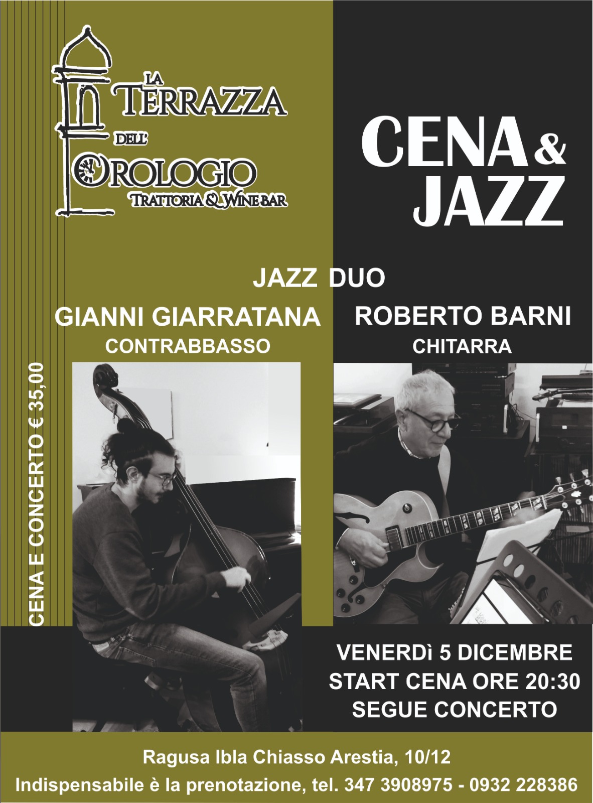 Venerdì 5 dicembre 𝗼𝗿𝗲 20:30 La Terrazza dell'Orologio | CENA E JAZZ 𝗝𝗮𝘇𝘇 𝗗𝘂𝗼 🎸Roberto Barni- 🎻Gianni Giarratana 🎼Un omaggio a Jim hall , Antonio Carlos Jobim e Ron Carter, attraverso brani standard e repertori tratti dalla tradizione swing, bebop e jazz modale. 🎻Jazz tra le corde🎸 👩🍳Chef: Giovanna Nicosia Cena ore 20:30 🎻🎸segue Concerto |