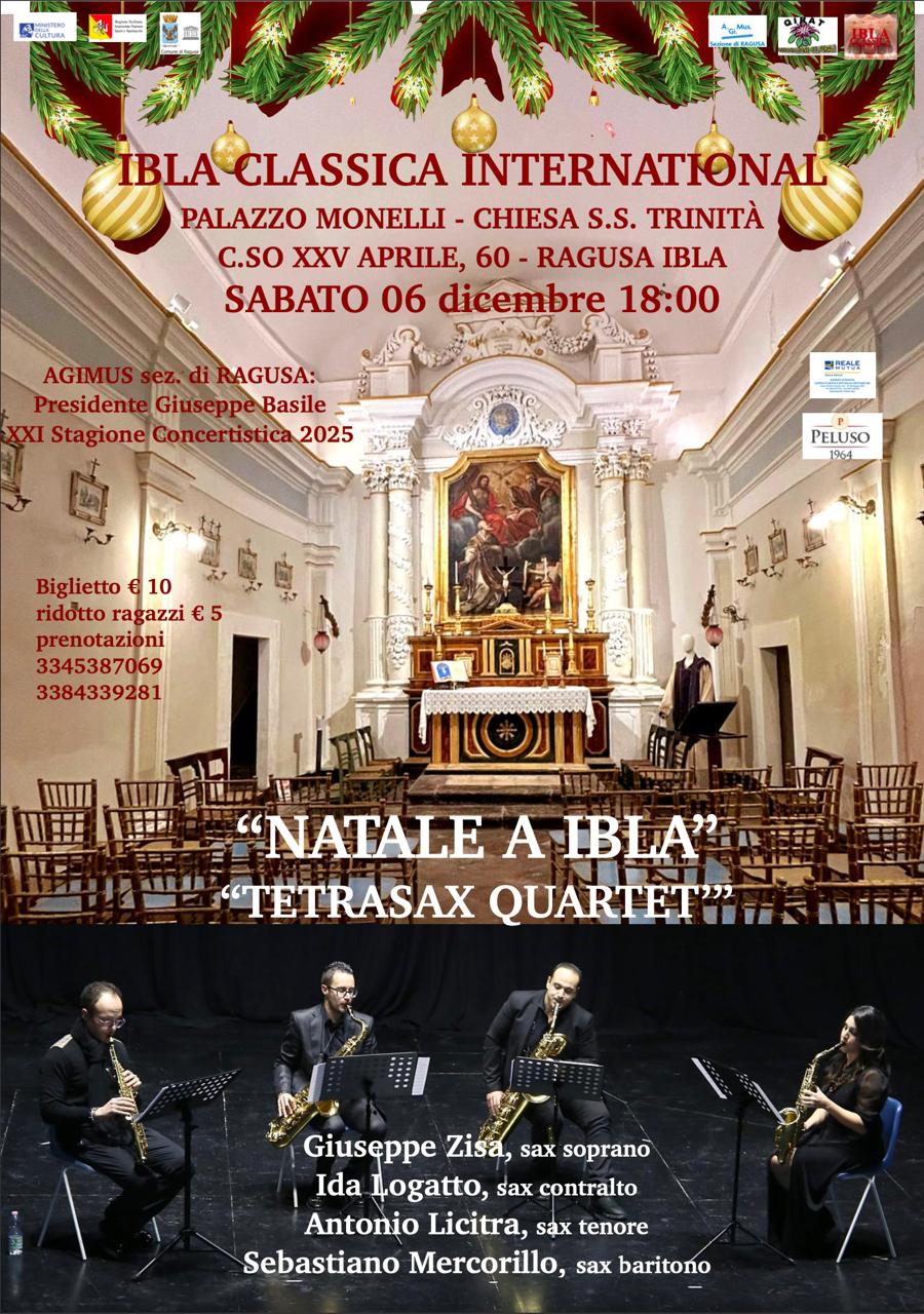 Sabato 6 Dicembre 18:00 IBLA CLASSICA INTERNATIONAL - XXI Stagione concertistica 2025 Palazzo Monelli - Chiesa S.S. Trinità Corso XXV aprile 60 - Ragusa Ibla Giuseppe Zisa - sax soprano Ida Logatto - sax contralto Antonio Licitra - sax tenore Sebastiano Mercorillo - sax baritono Biglietto € 10 ridotto ragazzi € 5 prenotazioni: 3345387069 / |