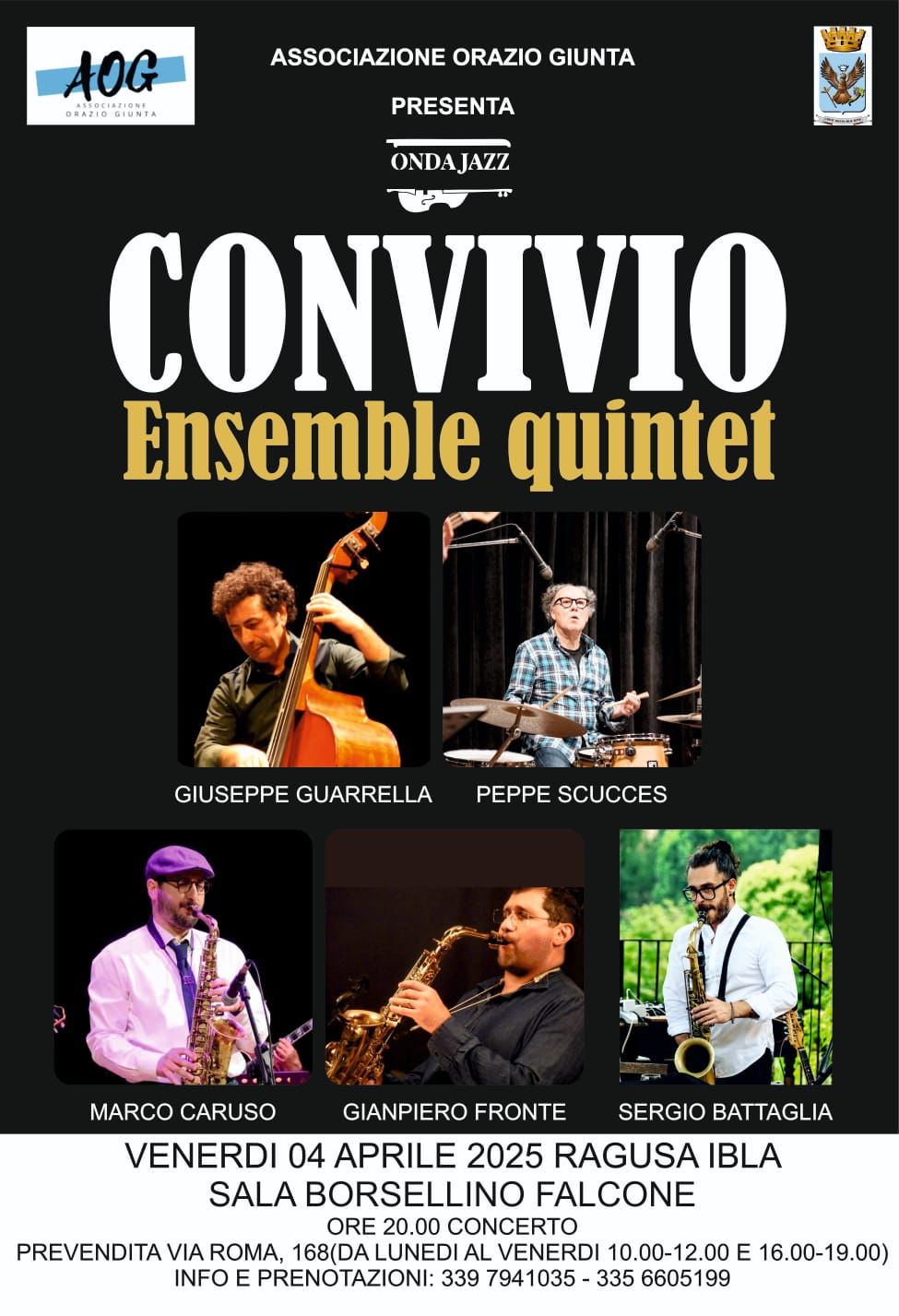 Associazione Orazio Giunta presenta "Convivio Ensemble Quintet". Gli ospiti saranno: Giuseppe Guarrella, Peppe Scucces, Marco Caruso, Gianpiero Fronte e Sergio Battaglia. L'evento si terrà venerdì 4 Aprile 2025 presso Ragusa Ibla, nella sala Borsellino Falcone alle ore 20:00. La prevendita è disponibile in via Roma 168 (da lunedì al venerdì 10:00-12:00 e 16:00-19:00). Per info