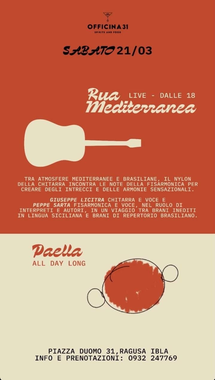 Ad accompagnare l'evento musicale, è disponibile la paella al day long! Tra atmosfere mediterranee e brasiliane, la chitarra incontra la fisarmonica per creare delle armonie sensazionali. Giuseppe Licitra suona la chitarra e Peppe Sarta la fisarmonica, nel ruolo di interpreti, autori e cantanti, in un viaggio tra brani inediti in siciliano e brani di repertorio