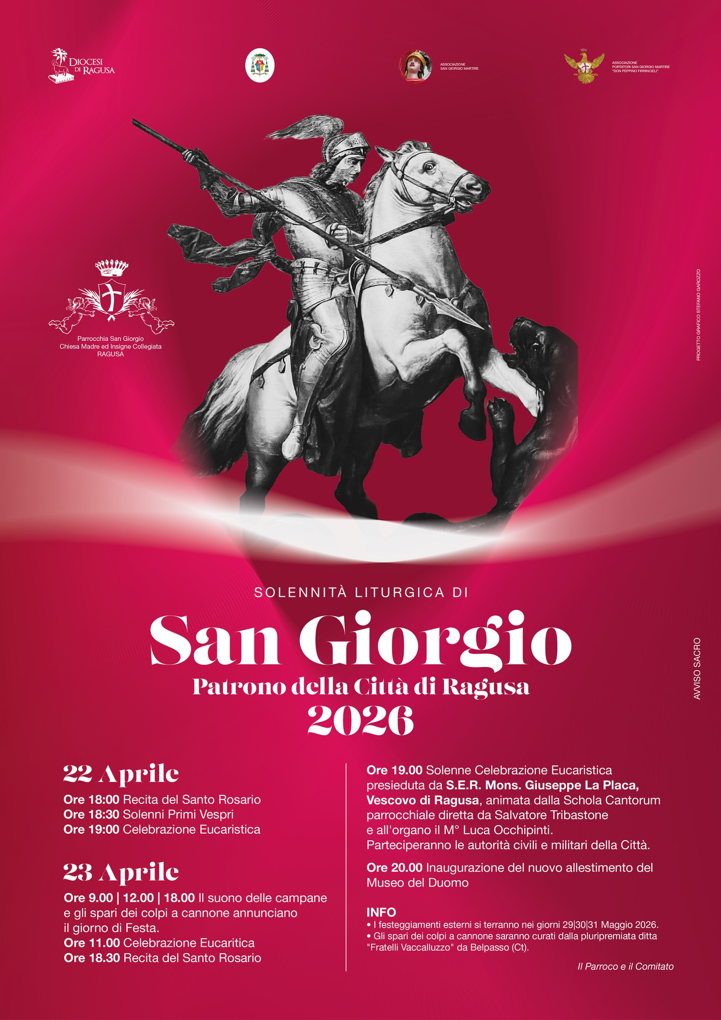 Programma dellaย solennitร liturgicaย diย San Giorgioย Martireย di giorno 23 Aprile 2026: Ore 09.00| 12.00 | 18.00: Il suono delle campane e gli spari dei colpi a cannone annunciano il giorno di Festa. Ore 11.00: Celebrazione Eucaristica Ore 18.30: Recita del Santo Rosario Ore 19.00: Solenne Celebrazione Eucaristica presieduta da S.E.R Mons, Giuseppe La Placa, Vescovo di Ragusa, animata |